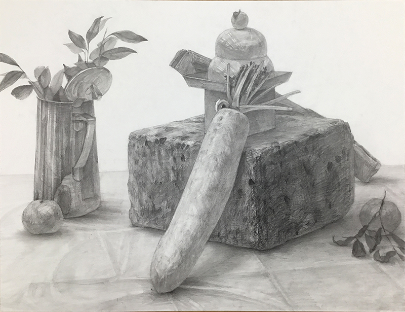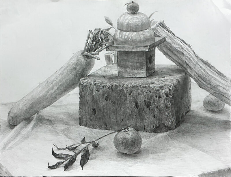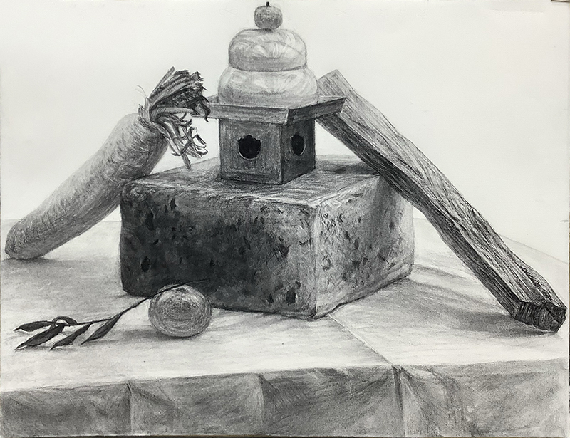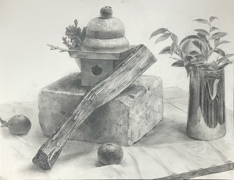 つるりとした鏡餅とザラザラな大谷石の質感の差をしっかり出すのがコツかな。石を中心として手前と奥に配置された各モチーフの距離感も意識的に表現したいですね〜。何気に直線が多いのでパースに歪みがあると命取りになりそう。