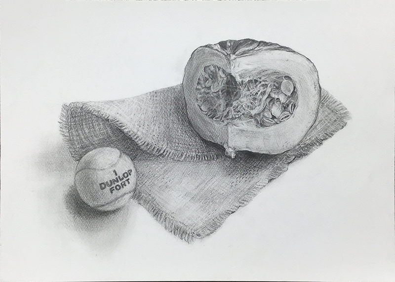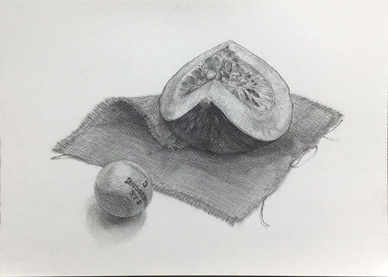 3つの異なる質感、形態の違いをきちんと描きわけることが出来ていますね。特にカボチャがいい!包丁でザクっと切った断面の感じがすごく伝わってきます。