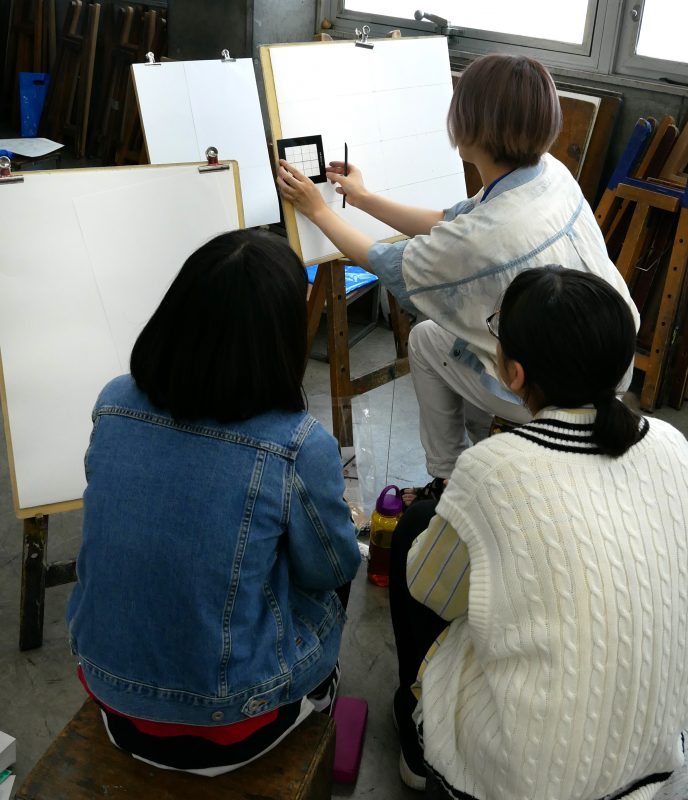 初めてデッサンに取り組む人に向けて、鉛筆や木炭の削り方、画用紙の表裏や用具の使い方に始まり、デッサンの描き出し・進め方の解説含めたデモストを行いました。
