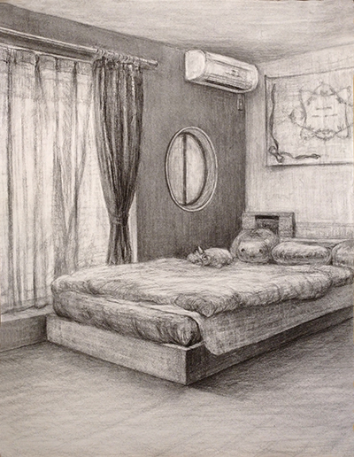 静物素描、視点を変えた自画像素描に続き、空間素描です。