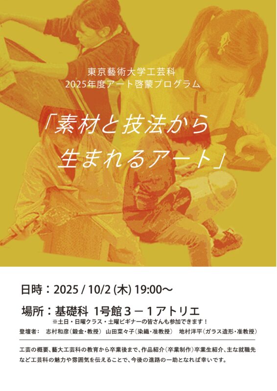 先日、基礎科では東京藝術大学工芸科から先生方をお招きして、アート啓蒙プログラム「素材と技法から生まれるアート」を行いました!