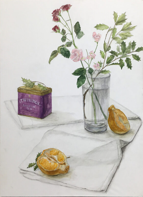 植物の質感と金属・布の対比を的確に捉え、色と明暗を整理しながら、落ち着いた画面構成にまとめてられています👏
