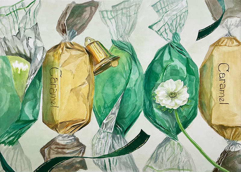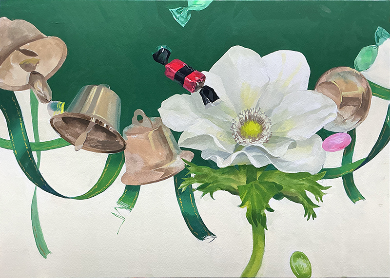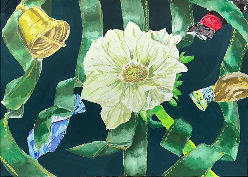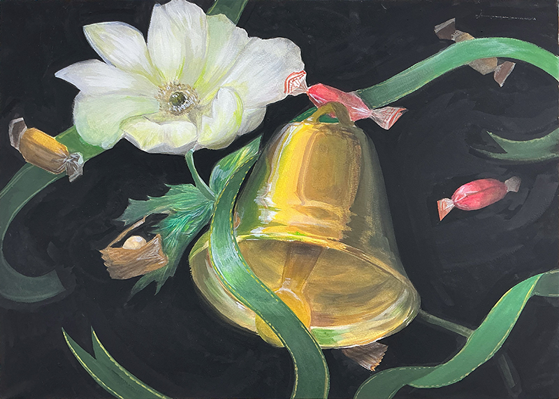 性質の異なるモチーフ達を、形と色の関係として整理できており、画面に意図がはっきり表れていますね。