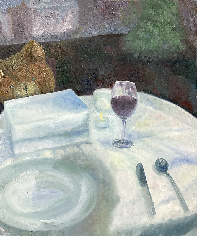アトリエの風景まで描く、要素は少ないけど具体的な場はある白壁(パーテーション)設定、白抜き背景。背景の設定、色の扱いによって卓上モチーフの描く色の設定がそれぞれことります。