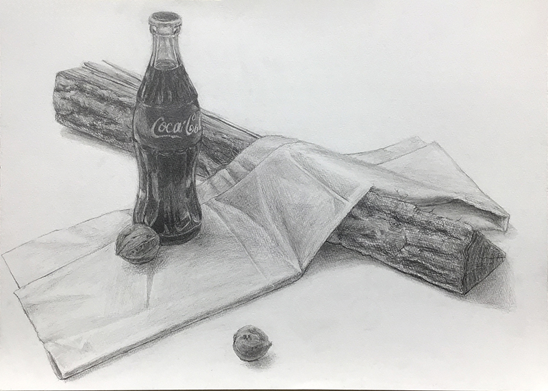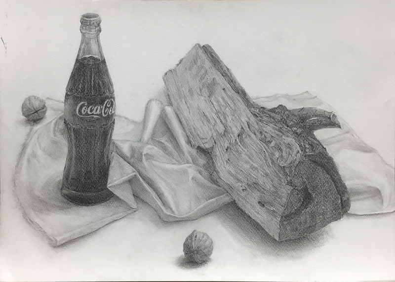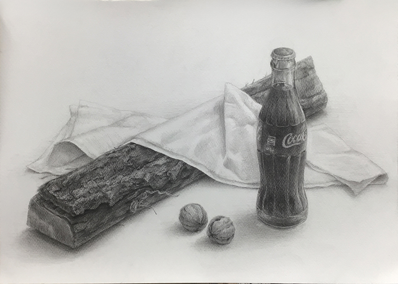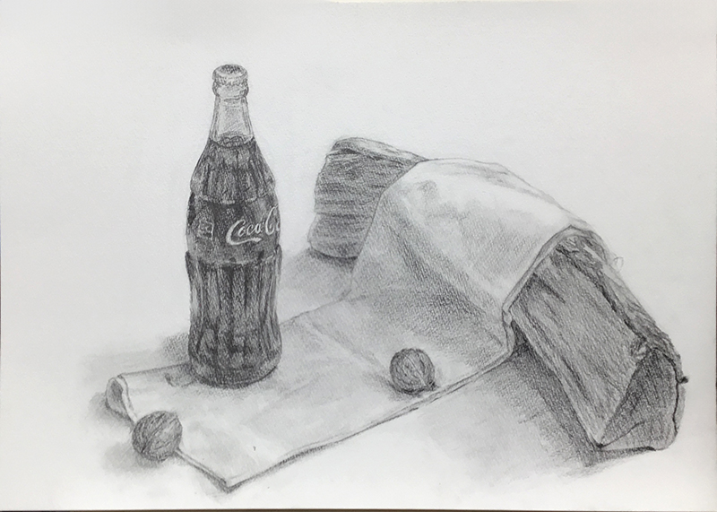 ビギナーデッサンコースは、薪・コーラ瓶・胡桃・白布でした。