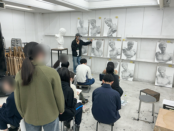 4ブースに分かれて個別講評会を行なっています。油画は石膏デッサンといえども“絵画性”が重要視されるので様々な絵が出来上がってきます。