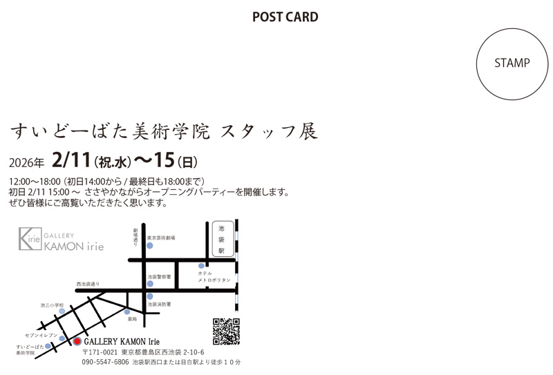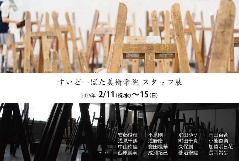 すいどーばた美術学院 スタッフ展のお知らせ 2026/01/19 すいどーばた美術学院のスタッフによるグループ展のお知らせです! どの作品も、この日のために研鑚してきた力作揃だと思います。 お近くの方は是非足をお運びください!お待ちしております。 会期:2026年2月11日(祝.水)〜2月15日(日) 12:00〜18:00 ※初日は14:00から/最終日も18:00まで 初日2月11日 15:00から、ささやかながらオープニングパーティーを開催します。 会場:GALLERY KAMON irie 2026年1月19日(月)〔学院から , 展覧会のお知らせ〕