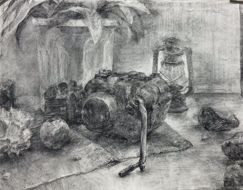 ↑また違った切り口からのデッサンです。エンジンのメカニックさを中心として周りのモチーフで空気感を演出できています。後ろのランタンがぼんやり輝いているよう…!
