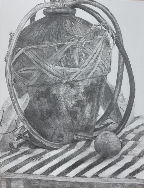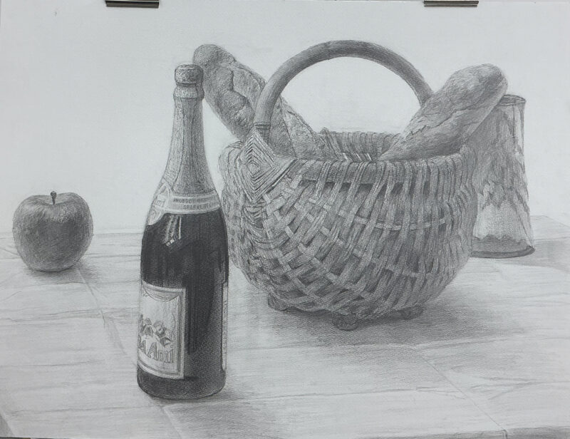 ↑カゴに入ったフランスパンとワイン🍷カゴの複雑な網目をしっかり観察しながら描けています。