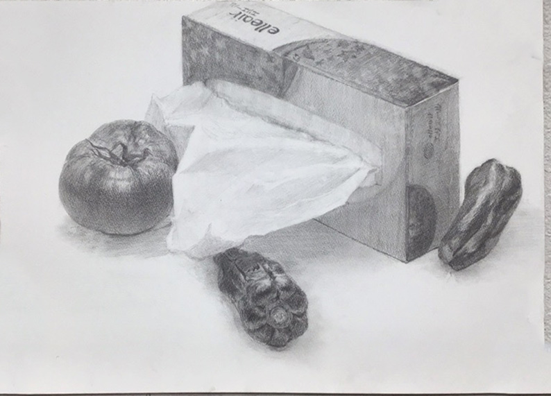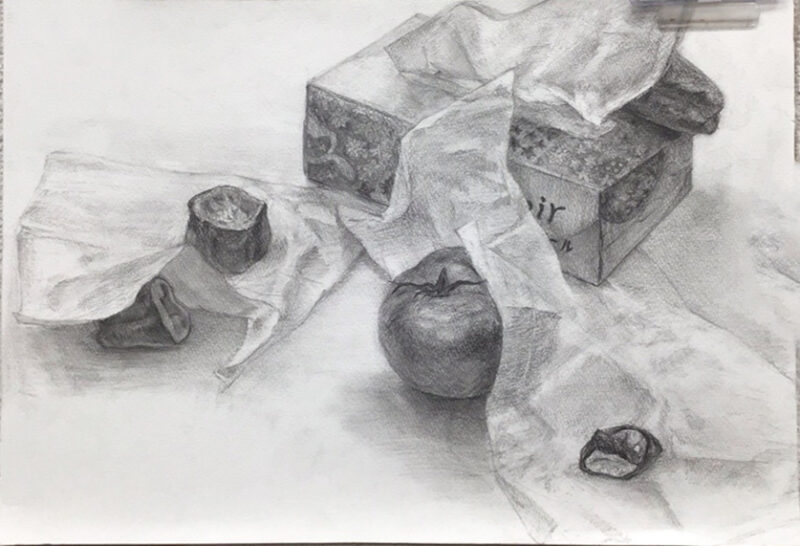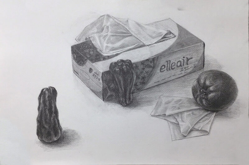 箱の形どりや、質感を描くのに苦戦している学生さんが多かった印象ですが、最後まで粘って描けていました👏