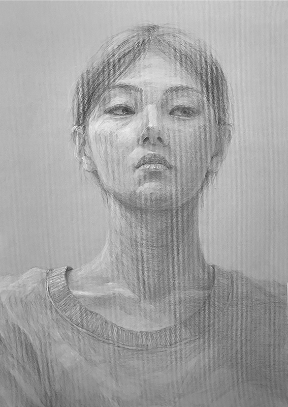 いつもの真っ白い紙に黒(陰影)で描き進めて、ある程度暗い色がついてきたら、練りゴムなどを使って白(光)描き入れていくのとは違って、グリザイユはグレーの用紙に白(光)と黒(陰影)で描いていくので、グレー(中間色)が既にある状態に白色を自分で描き足していくわけですな。