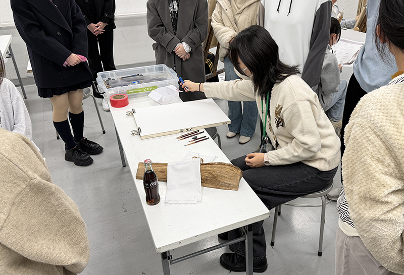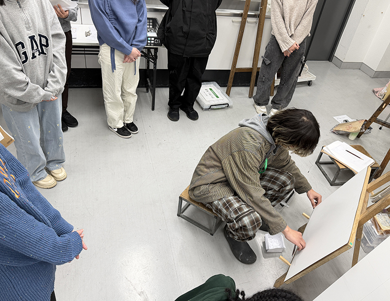 実技はなかなか言葉だけではイメージが伝わらないので、基礎科では講師が実演したり参考作品や参考資料などを使って具体的な説明をしています。