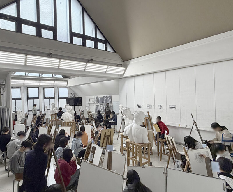 油画コースが制作している1号館最上階のアトリエは、天井が高くて開放的!