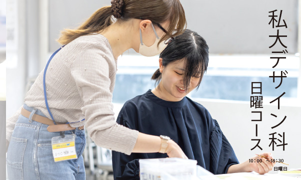 昼間コース・夜間コース共に平面系は多摩美 グラフィックデザイン・武蔵美 視覚伝達デザイン、立体系は多摩美 生産デザイン(プロダクト・テキスタイル)・武蔵美 工芸工業・空間演出デザインを中心にその他専攻も含めデッサン・平面構成など様々な対策をしています。