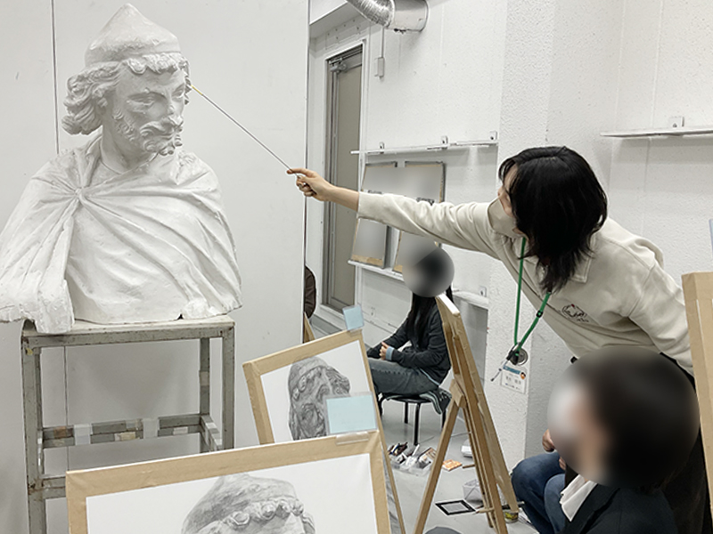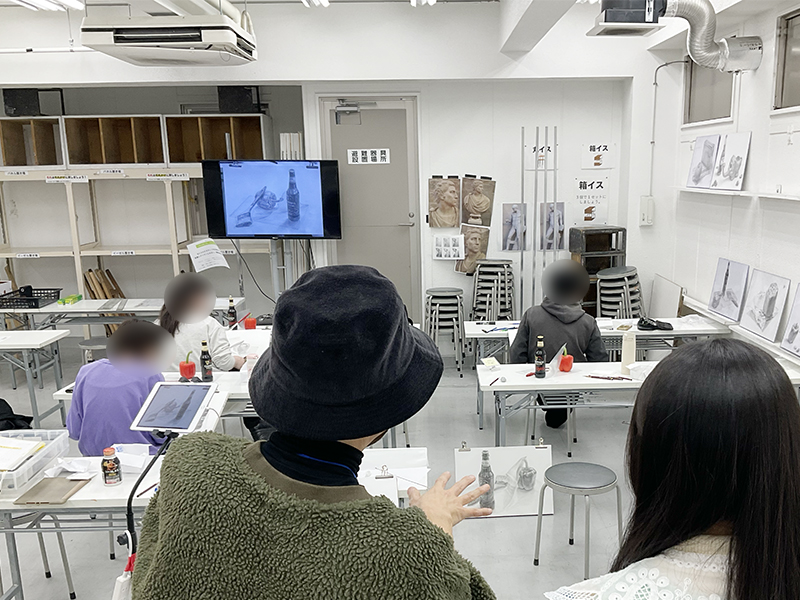 基礎科では、全コースで初めて実技を取り組む方や初心者に向けて丁寧に画材説明含めた導入を行なっています。