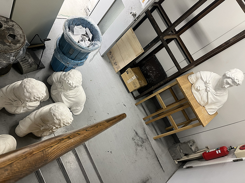 腰を屈めて、制作者となるべく同じアイレベル(目線の高さ)で作品&石膏像の見え方をチェックします。