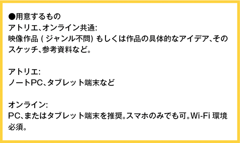 オンラインで受講した講習会では、制作中に先生と会話する機会が多くあります。会話することで、映像としてのイメージがより具体的になったり、自信の持てる作品に繋がりました。私は一人で思い詰めてしまうことが多かったのですが、先生の方から積極的に話しかけてくれたので、作品の幅が広がったり漠然とした部分の解消など助けられた場面が多くありました。一人で悩んでしまっているときこそ、先生との会話は大事です。