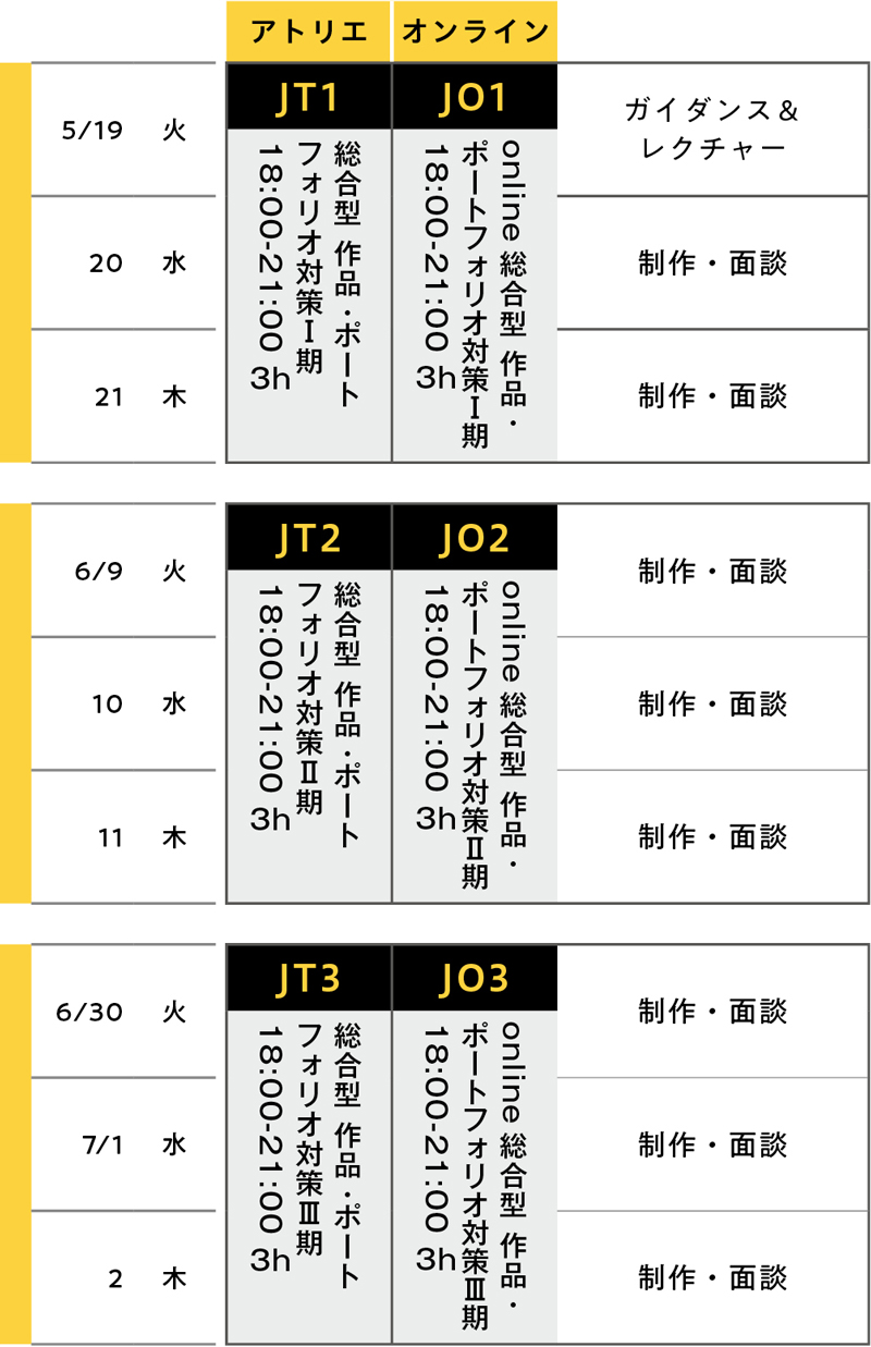 武蔵野美大映像学科「クリエイション資質重視方式」、多摩美大情報デザイン学科メディア芸術コース「オンラインポートフォリオ」をはじめ、東京造形大などの総合型選抜で、作品やポートフォリオの制作を必要とする入試の対策をするコースです。