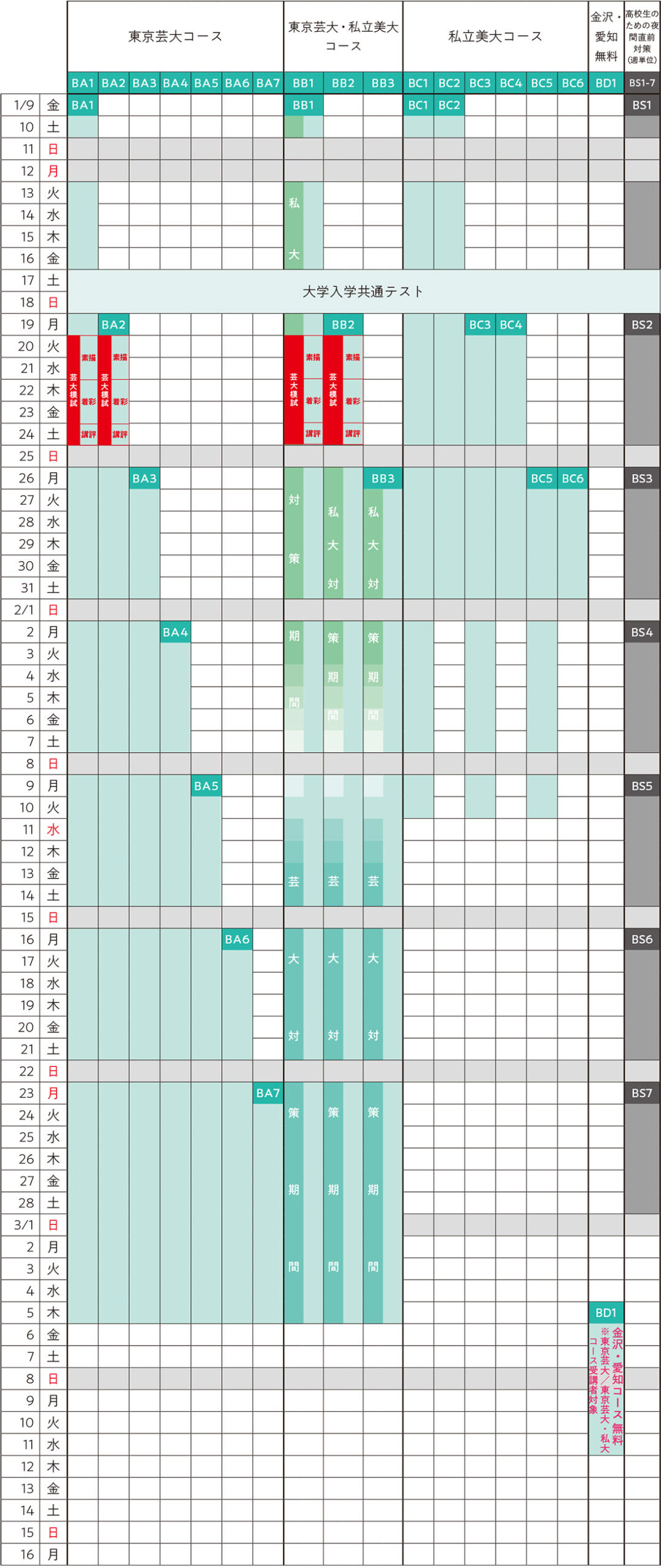 東京芸大を受験後、金沢美術工芸大学・愛知県立芸術大学の対策を行うコースです。短い期間ですが各校の入試に沿った課題を集中的に学びます。